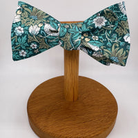 Your Self-Tie is made from a Liberty of London fabric which we chose for its iconic William Morris print incorporating birds & flowers. We loved the vibrant teal green on the contrasting dark green background, along with the olive green foliage.